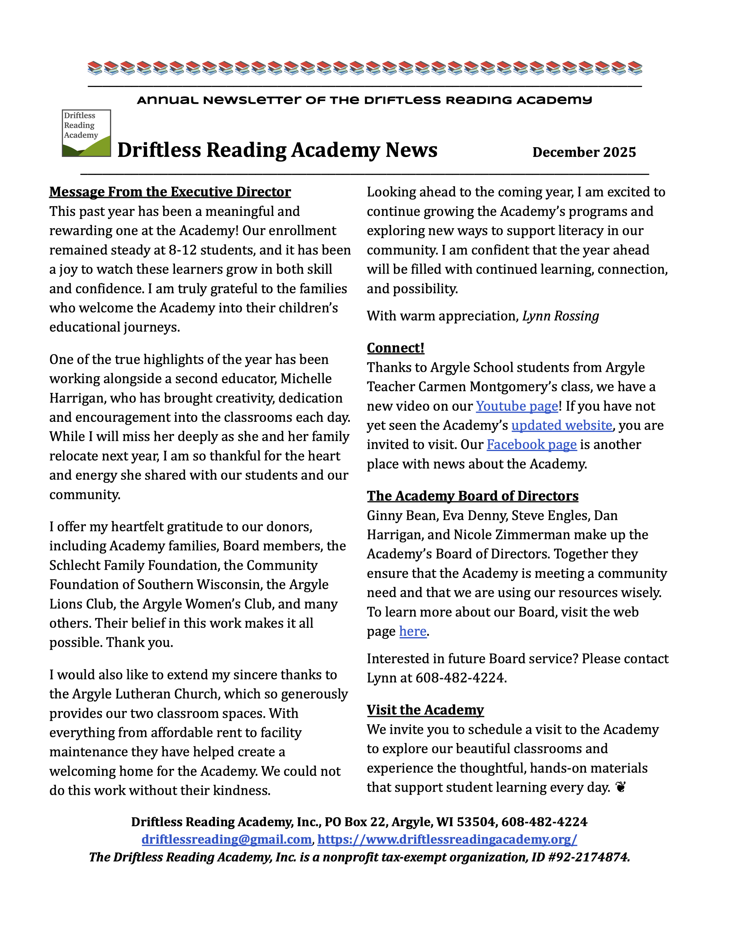 Lynn Rossing founded the Driftless Reading Academy in 2023. An AMI-trained Montessori teacher, she taught in mixed-age classrooms for 20 years in Madison and Portland. In addition she is a certified adult literacy tutor. She has served on the boards of the Argyle Public Library and Sunstone Montessori School.
